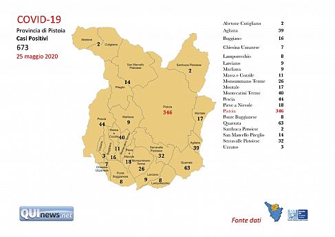 Sono 673 i casi complessivi a oggi a Pistoia. La Toscana si conferma al 10° posto in Italia come numerosità di casi, con circa 270 casi per 100.000 abitanti.