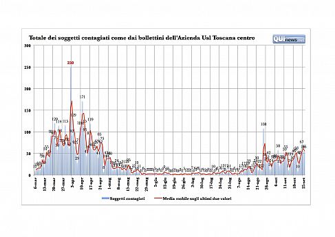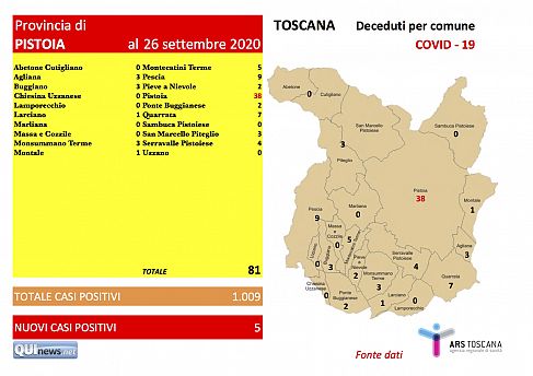 Nelle ultime 24 ore nel territorio regionale sono stati riscontrati 110 nuovi contagi, cinque dei quali in provincia di Pistoia dove, da inizio epidemia ad oggi, si contano 1009 casi di Coronavirus.