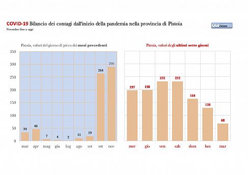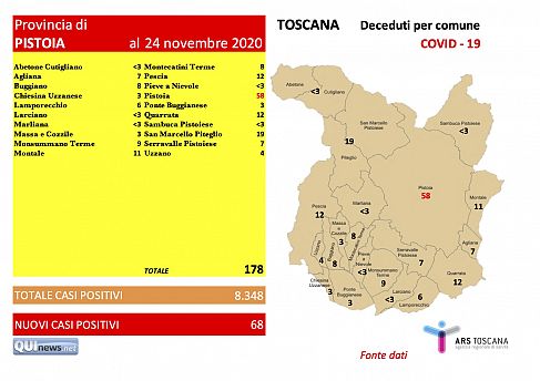 Nelle ultime 24 nella provincia di Pistoia sono stati rilevati altri 2 decessi rispetto ai 5 registrati il giorno precedente. Salgono così a 178 i deceduti dall'inizio dell'emergenza sanitaria.