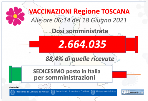 Nella prima tabella la percentuale dei tamponi positivi sui casi sospetti, nella seconda le vaccinazioni nella Regione Toscana e nella terza la data prevista di somministrazione al 70% dei toscani. Segue poi il primo grafico con i nuovi contagi, i pazienti positivi ricoverati in ospedale e quelli in terapia intensiva. Infine nel secondo grafico il totale dei casi positivi, dei positivi attuali, dei deceduti e dei guariti.