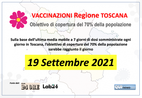 Nella prima tabella la percentuale dei tamponi positivi sui casi sospetti, nella seconda le vaccinazioni nella Regione Toscana e nella terza la data prevista di somministrazione al 70% dei toscani. Segue poi il primo grafico con i nuovi contagi, i pazienti positivi ricoverati in ospedale e quelli in terapia intensiva. Infine nel secondo grafico il totale dei casi positivi, dei positivi attuali, dei deceduti e dei guariti.