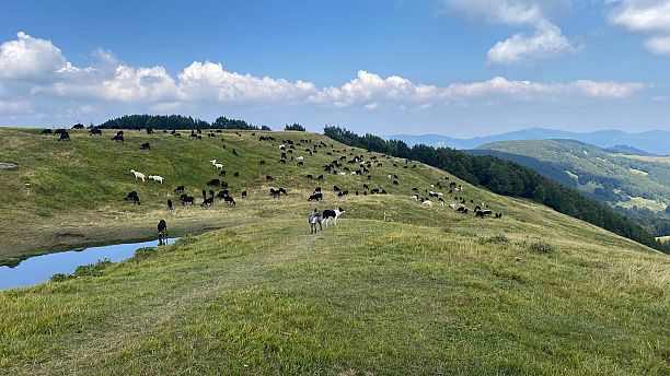 Poi sarà il turno di Daniela Pagliai che guiderà la sua mandria di bovini verso la Valle del Libro Aperto. Figlia e nipote di pastori così come il marito Valter, mettono insieme sei generazioni di pastori. Il loro viaggio, perché a muoversi è tutta la famiglia, inizia intorno alla prima settimana di giugno dalla località Il Melo di Cutigliano, a circa 1.000 metri di altitudine per terminare alla malga, nell’Anfiteatro del Paradiso, ai piedi della cima Tauffi a circa 1300 metri di altitudine. Per Daniela sarà il 42 esimo viaggio. “E’ una festa. Si aggregano tante famiglie ed amici. La camminata dura circa 2-3 ore attraversando campi e pascoli. – racconta Daniela – La mia prima transumanza risale all’età di 6 anni. I miei genitori non sapevano a chi lasciarmi ed allora mi portarono con loro. Stavo in coda al gregge. E’ durante una delle transumanze, quando avevo 18 anni, che ho conosciuto mio marito. La nostra famiglia nasce nell’alpeggio”.