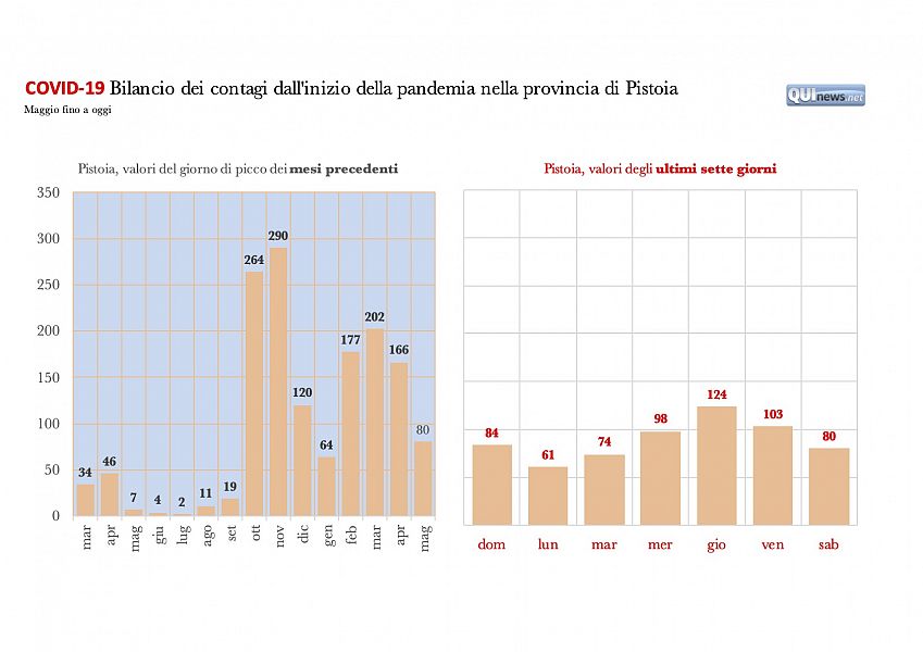 PISTOIA — Ancora 80 nuovi casi di contagio da coronavirus Covid-19 e 2 ulteriori decessi: questi i dati delle ultime ventiquattro ore in provincia di Pistoia tra città, piana, montagna e Valdinievole secondo i dati del bollettino quotidianamente emesso dalla Regione Toscana.